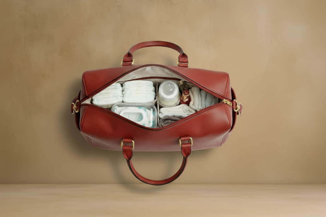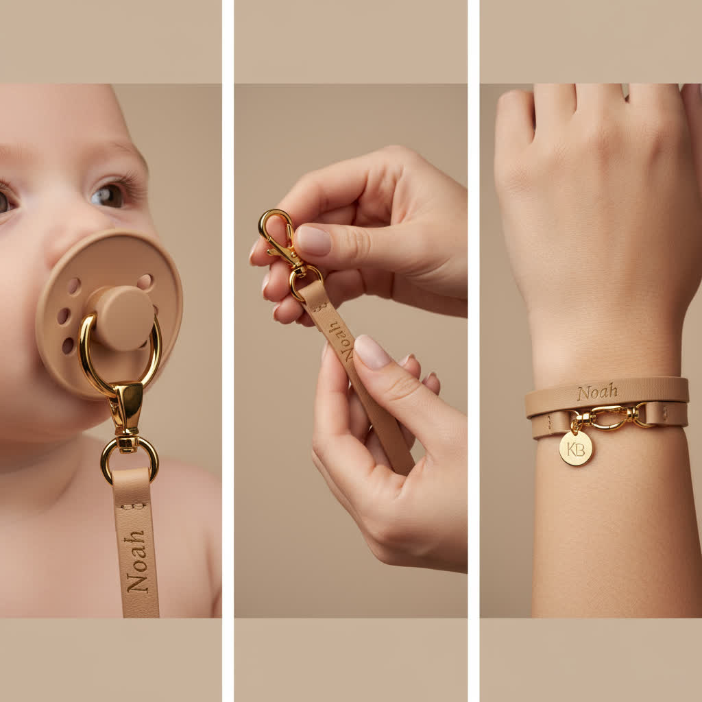 Crafted from genuine leather with gold-plated details, this smart design transforms from a pacifier clip into a stylish bracelet.