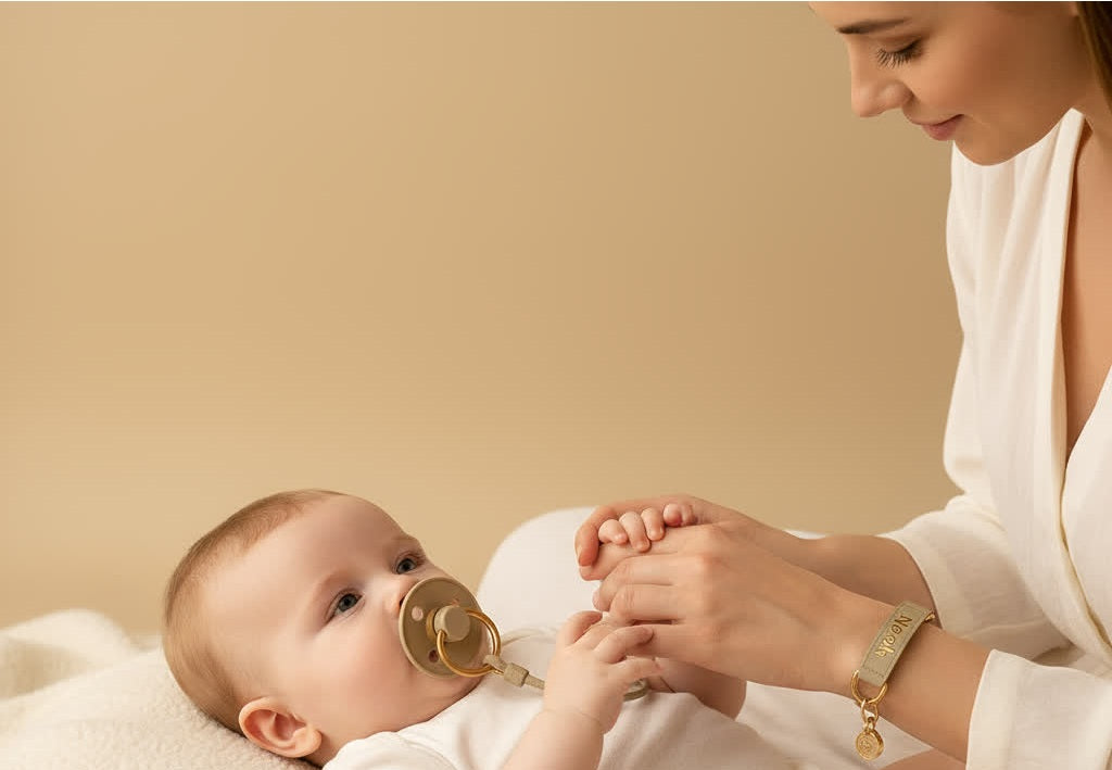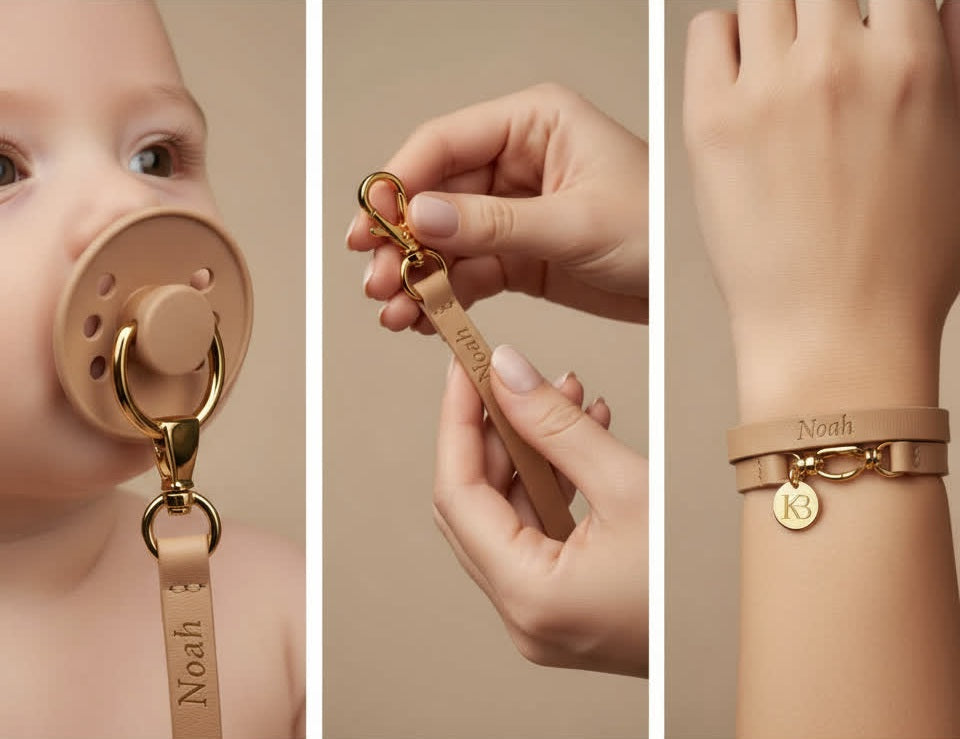 Crafted from genuine leather with gold-plated details, this smart design transforms from a pacifier clip into a stylish bracelet.
